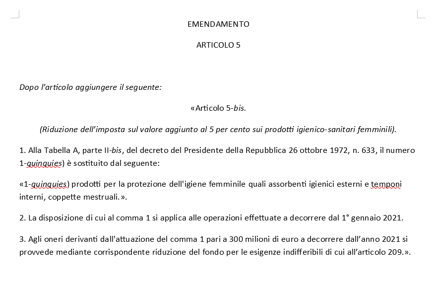 L’Italia prova a fare un altro passo in avanti su una questione fondamentale e che troppo spesso viene messa in secondo piano. Parliamo della tassazione sugli assorbenti. Mentre la Scozia diventa il primo paese a darli gratuitamente a tutte le donne, da noi si fatica ancora ad agevolare almeno la tassazione riducendo l’Iva. Prima firmataria della proposta di abbassare l’Iva dal 22 al 5%. Attualmente, infatti, su assorbenti, tamponi, coppetta mestruale – su tutti quei prodotti che devono necessariamente usare una volta al mese, ogni mese al netto di eventuali gravidanze – le donne pagano un’Iva al 22%. Come un bene di lusso.