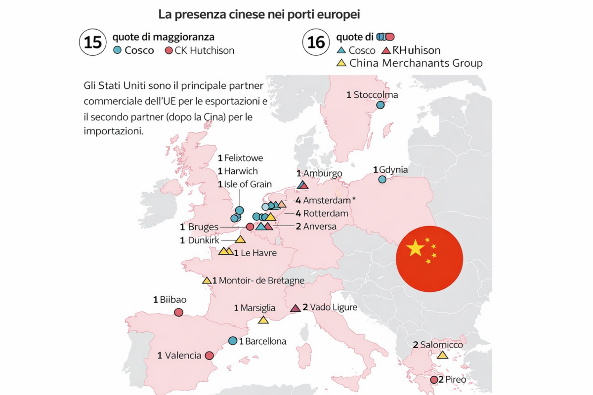 Uno degli aspetti meno visibili ma più rilevanti riguarda il controllo delle infrastrutture. Negli ultimi anni, operatori cinesi hanno acquisito quote in oltre 30 porti europei, inclusi nodi strategici nel Mediterraneo e nel Nord Europa.
