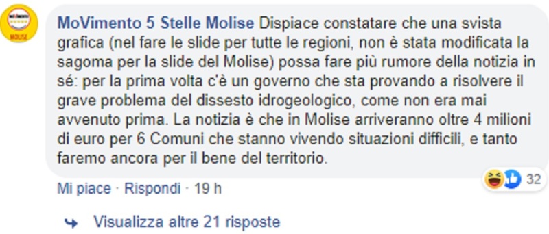 Infatti, nell’immagine allegata al messaggio appare la cartina della regione Marche anziché quella del Molise. Subito si sono scatenati commenti ironici e divertenti. Ad esempio, Francesco Lollobrigida, capogruppo di Fratelli d’Italia alla Camera, ha pubblicato il suo commento al post dei 5 stelle: “Questa volta il vento del cambiamento ha tirato così forte da spostare addirittura le Regioni. A questo punto speriamo che i fondi arrivino davvero in Molise, nulla togliendo alle Marche”.