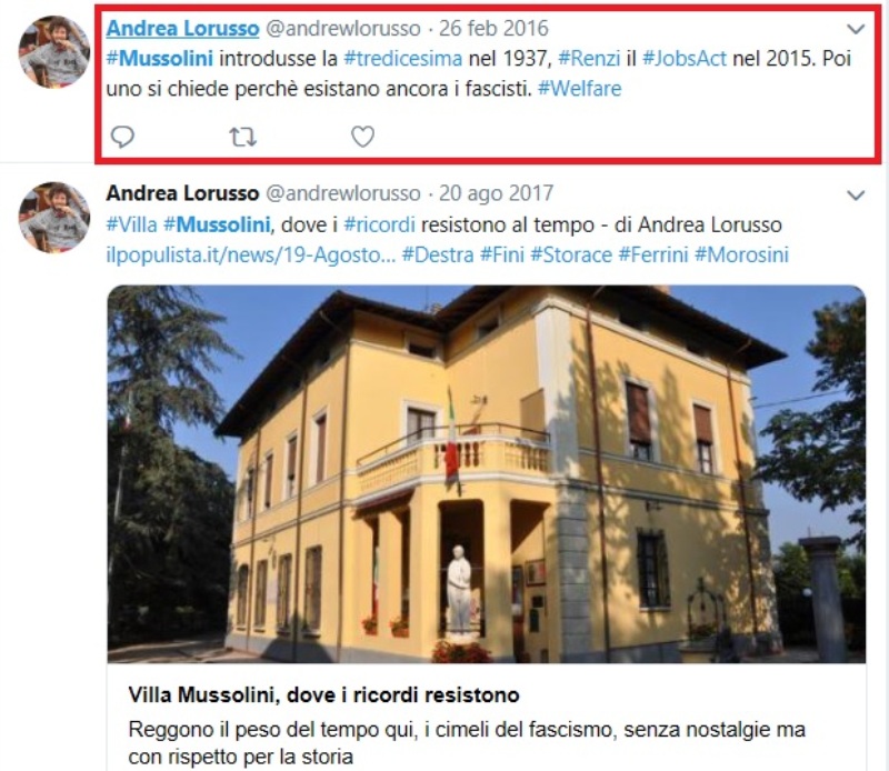 Eppure è bene condannare fermamente questo tipo di atteggiamenti, soprattutto sui social per evitare drammatici ritorni al passato e il veicolare di pensieri e affermazioni pericolosi per la tenuta democratica. Basta fare un giro sui profili twitter e facebook di Lorusso per constatare (molti li ha già cancellati e altri li sta levando in queste ore) i suoi continui inneggi al fascismo e alla figura di Mussolini.