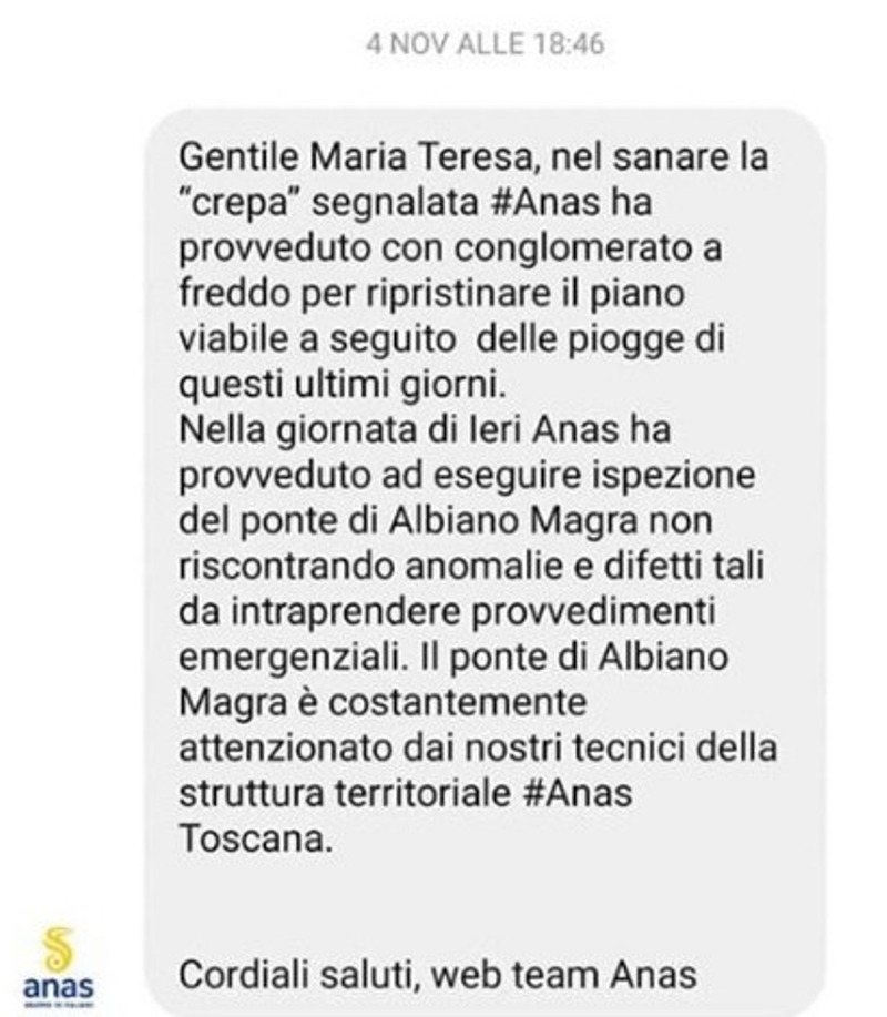 “Il ponte è costantemente attenzionato dai nostri tecnici della struttura territoriale Anas Toscana. Cordiali saluti, web team Anas”. Il messaggio, ovviamente, riletto oggi ha mandato su tutte le furie la popolazione italiana. E tutti “ringraziano” il blocco di questi giorni, altrimenti sarebbe stata l’ennesima tragedia.