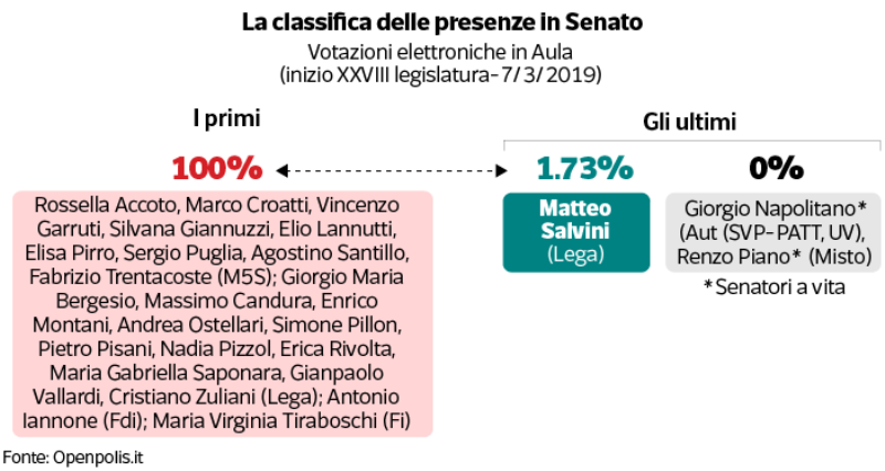 Salvini è il grande assente: al parlamento e al ministero non ci sta mai, lo dicono i dati. Analizzando date e luoghi sembra proprio che dal giorno del suo insediamento fino a fine febbraio 2019, il vicepremier sia stato presente al Viminale sì e no una decina di giorni al mese (a luglio e ottobre), calando fino a cinque in dicembre e in agosto. Quanto al parlamento, il sito openpolis.it, che compie un meritorio monitoraggio quotidiano sull’attività di deputati e senatori, dice che ci va ancor meno. Alla voce Salvini Matteo, le presenze alle votazioni in aula (57 su 3286) sono ridotte all’1,73%.