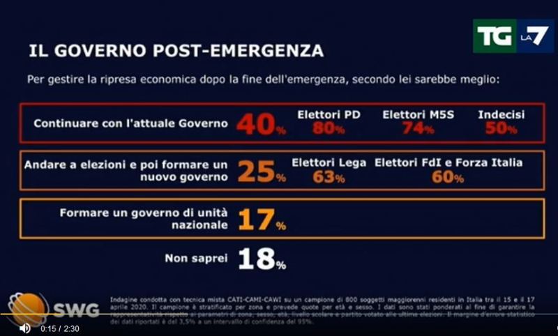 Tra questi l’80% degli elettori del Partito Democratico, il 74% degli elettori del MoVimento 5 Stelle e il 50% degli indecisi. Quest’ultimo dato è molto interessante perché significa che anche quelli che ancora non hanno deciso con chi schierarsi riconoscono al governo Conte una certa autorevolezza e competenza. Il 17% invece vuole formare un governo di unità nazionale, ovvero il progetto strisciante che in questi giorni gira tra settori della maggioranza e della minoranza con premier Mario Draghi.